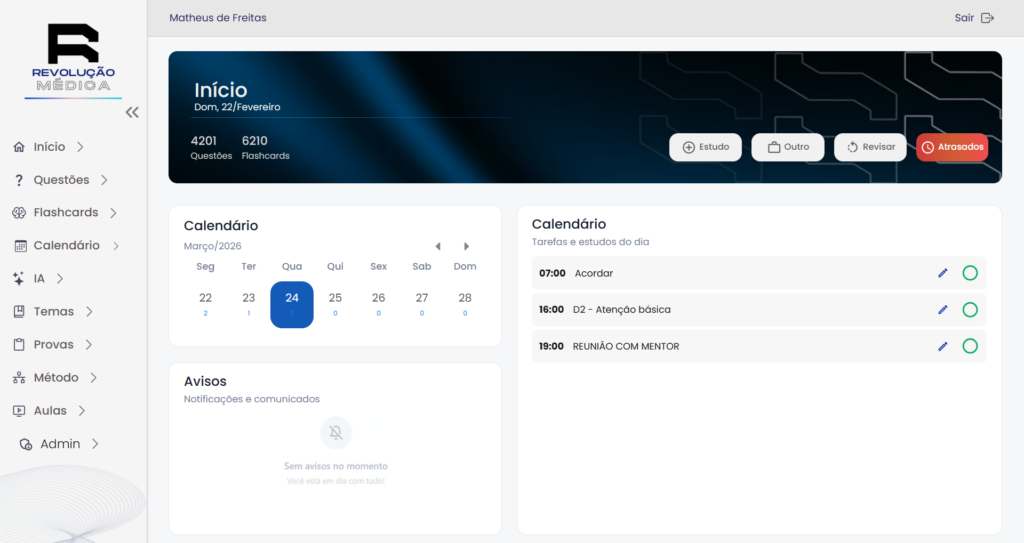 A plataforma não apenas organiza o estudo. Ela controla sua evolução.